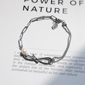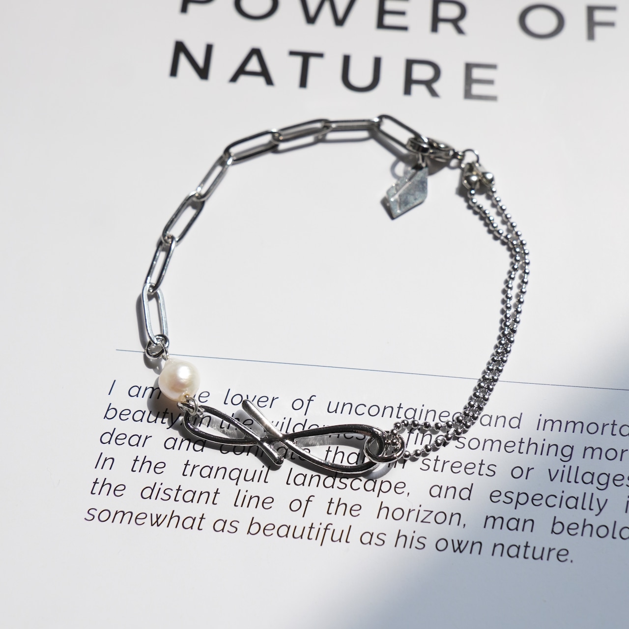 2種類のチェーンに、照りが美しい淡水パールとシルバーの結び目のようなパーツを合わせた、シンプルだけど人と被りにくいデザインのブレスレットになっております。