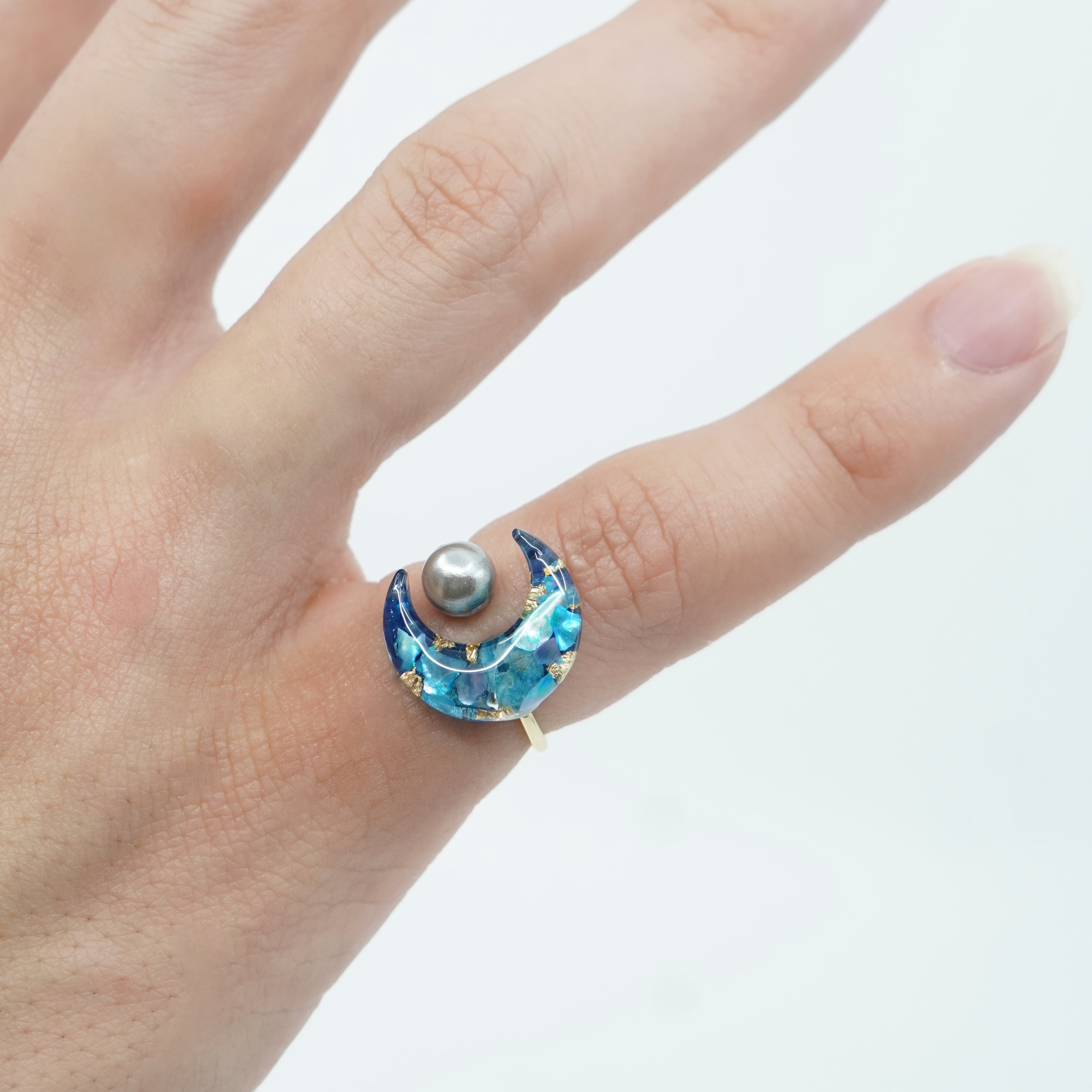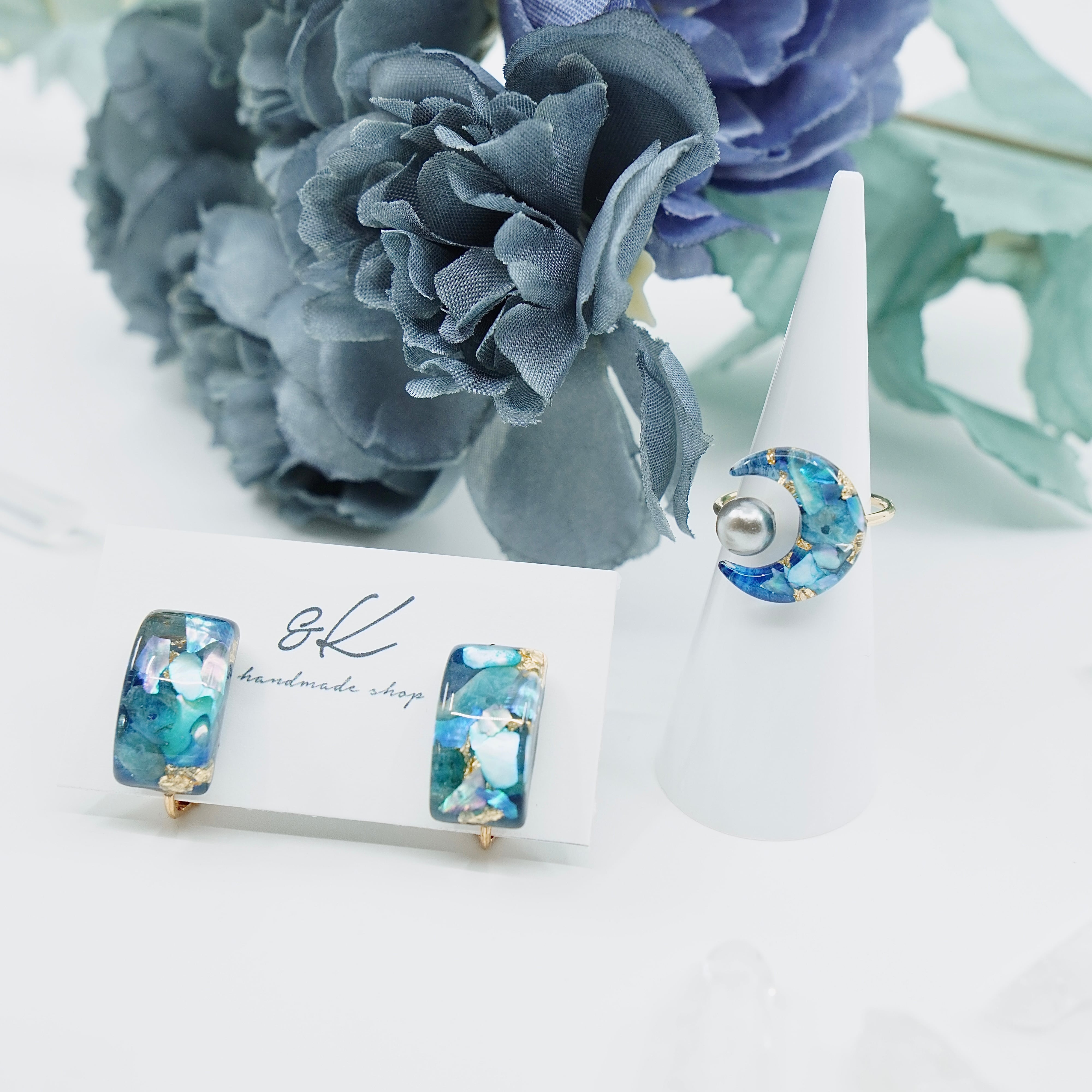 多様な青色のシェルや天然石、箔をバランスよく重ね合わせることで奥行きを出しつつ、裏面は水彩で色付けました。